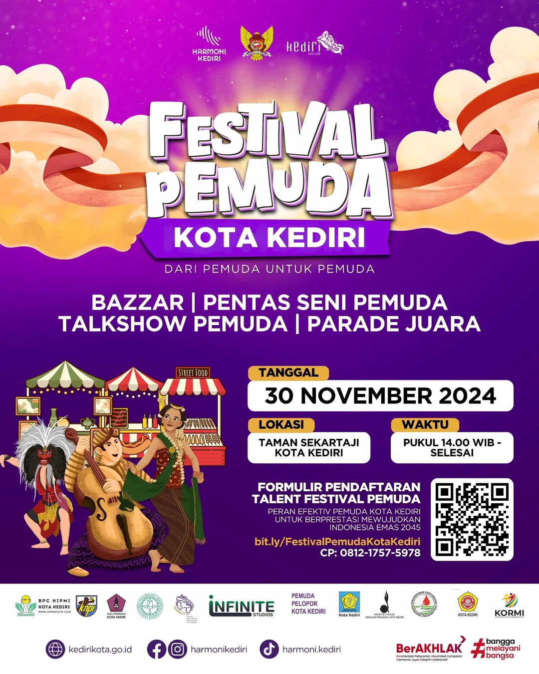 Pemerintah Kota Kediri melalui Dinas Kebudayaan, Pariwisata, Kepemudaan dan Olahraga Kota Kediri akan mengadakan kegiatan Festival Pemuda yang diselenggarakan pada :